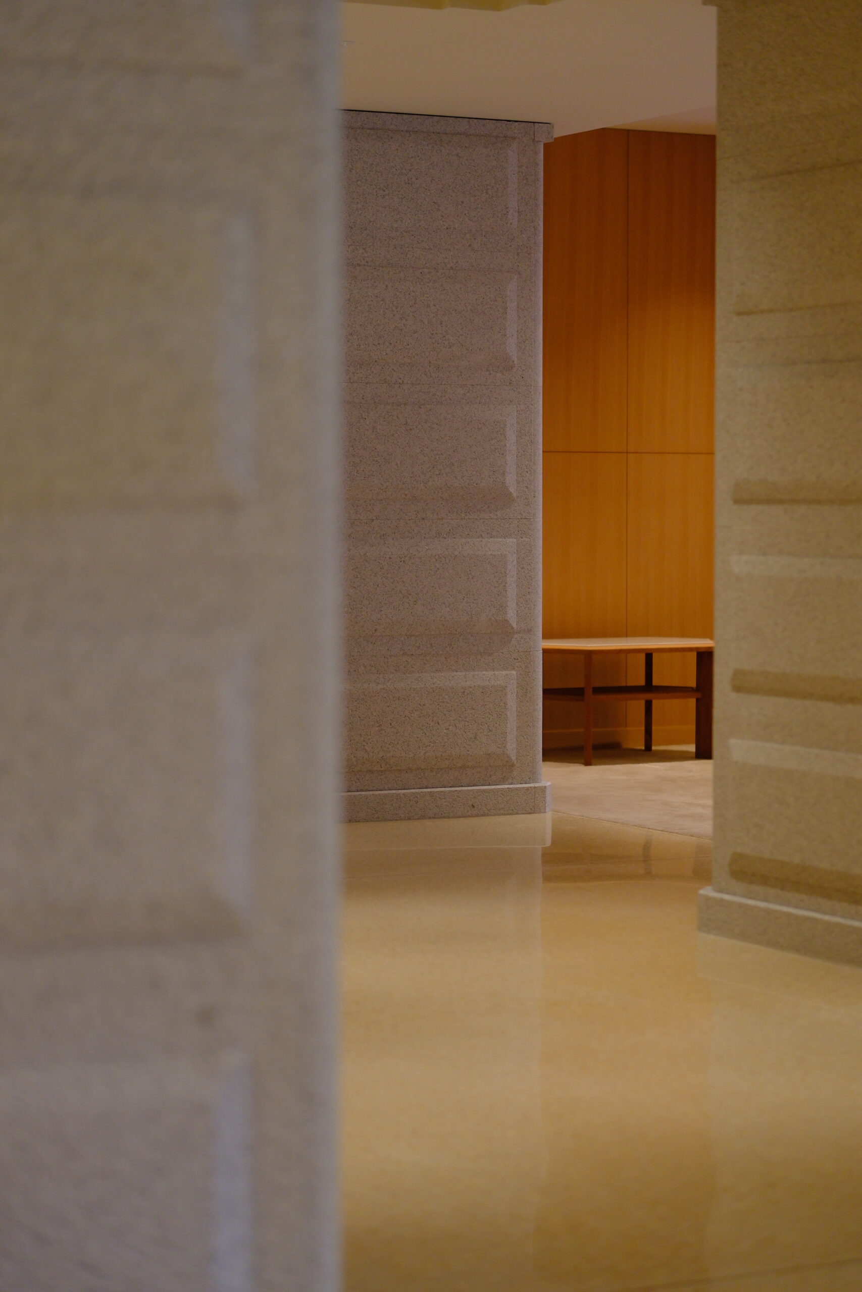 The interior reflects this dialogue, preserving the presence of the 90-year-old theatre while integrating Wright-inspired geometric motifs, alongside replicas of terra-cotta and Oya-stone pillars that echo the Wright Imperial. What defines Sakakida’s work is his use of primitive materials, stone and wood, woven effortlessly into refined Japanese architecture, creating a quiet yet striking sense of contrast.